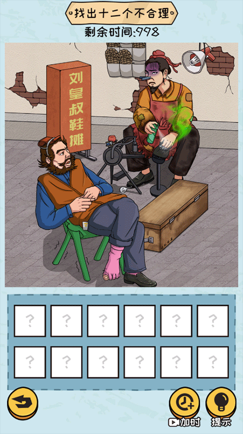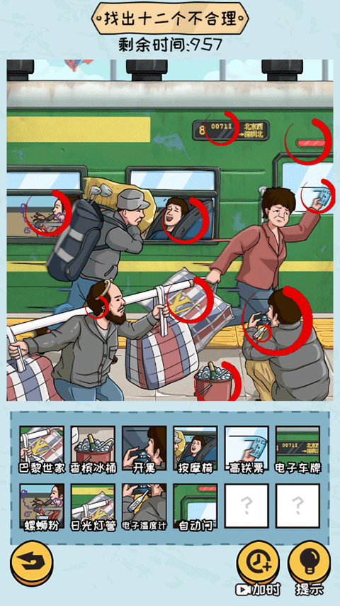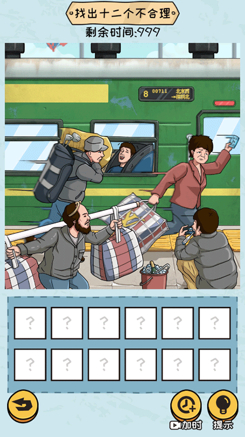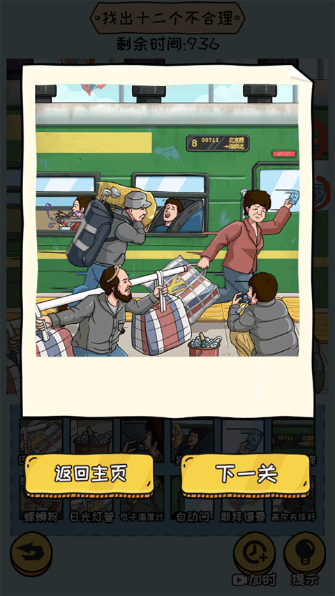 4、请仔细观察,从中找出十二个不合理的物品。在此过程中,存在时间限制,而且若玩家点错,将会扣除一定时间。