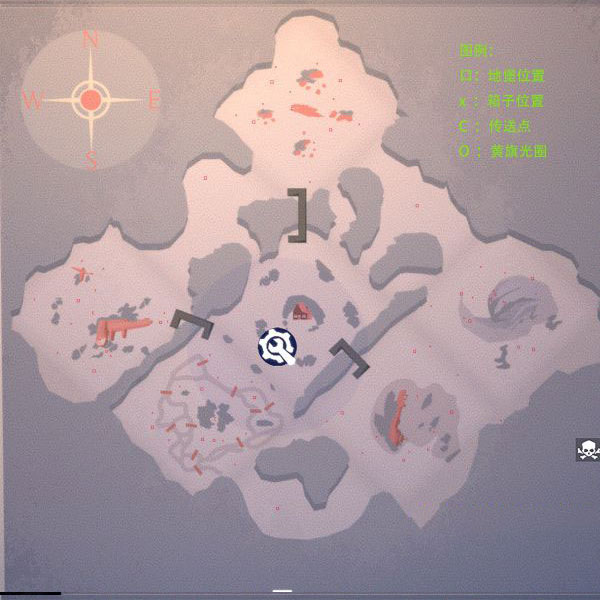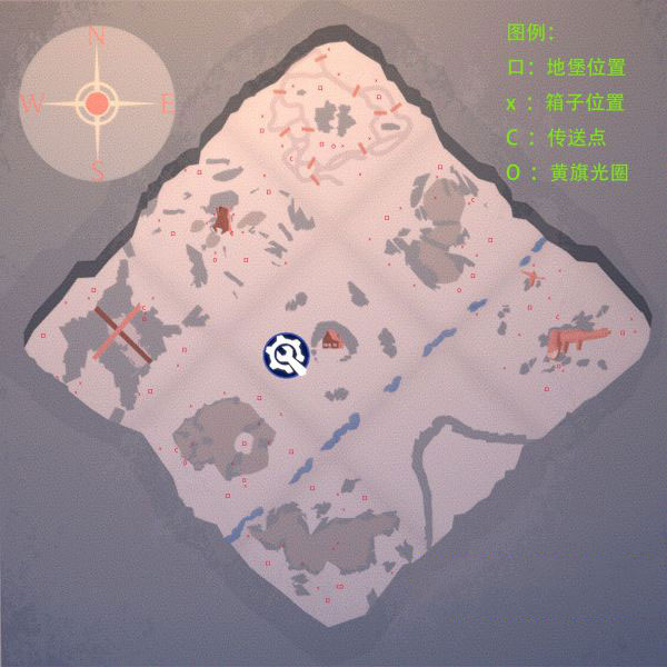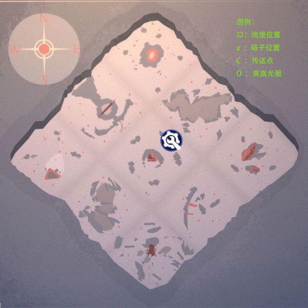 在这6张图里,这张图是最贫瘠的。整个地图周边仅有5处存在地形,WN、NE以及S这三个区域都仅有一个地堡,且没有任何箱子。在WN和NE的炸桥点附近还各有三匹狼(WN是三只白狼,NE是三只黑狼),打野挖宝时稍不留意,就很容易无功而返。
