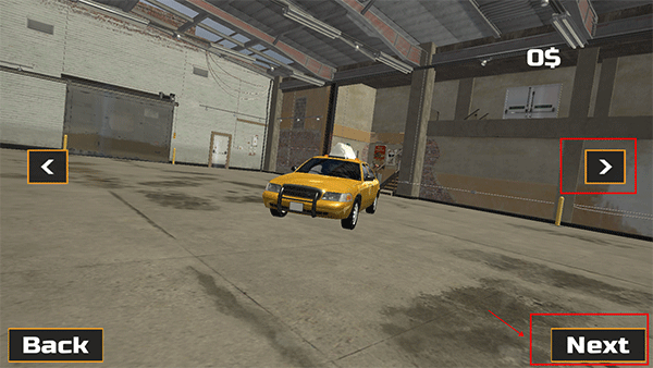 1. 在游戏开启之前,你得先挑选一辆心仪的出租车,点击【>】能够切换车辆,挑选完毕后点击next。