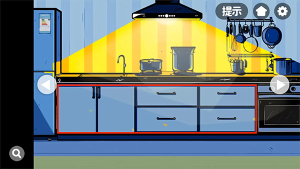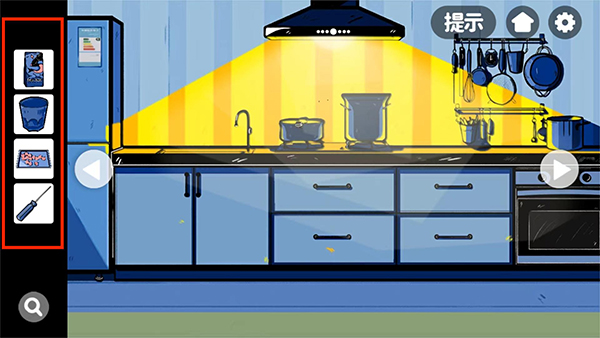 6、进入到厨房,通过点击柜子和抽屉可以获取到、猫粮、水杯、螺丝刀和棉花糖,