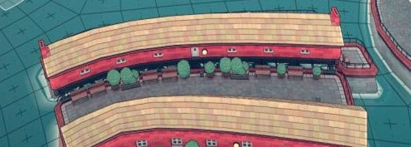 4、把成排房屋的地面设计成镂空样式,减少两侧的门数量,同时在两侧增添植物与长椅,营造出公园般的氛围。