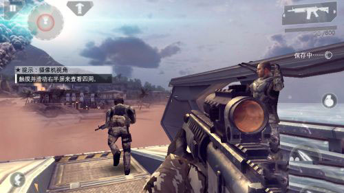 2、任务更新为保护桑德斯,记住不要下去,就在台上射击敌人,尽量开瞄准镜,其实这地方有点难,如果台上瞄不准的话,就建议直接冲到桑德斯旁边,给他当肉盾,顺利完成后,上楼,清完阻碍你们的敌军后,上飞机走人,第二关结束。