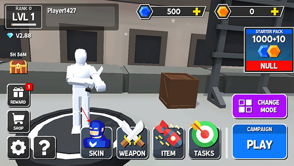 3、一局对战结束你将会回到主界面,首先点击skin选项