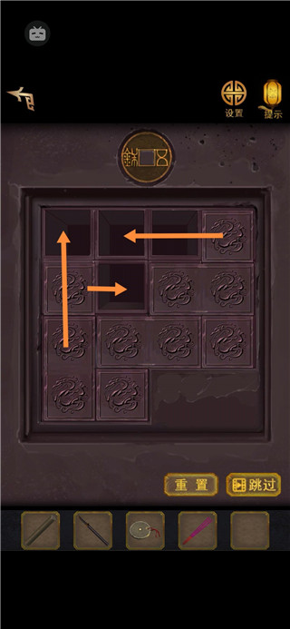 12、墙上挂画旁边绳子一拉,画卷起,露出后面机关,把铜块安上去。按印章顺序拖动图案和字。开门。