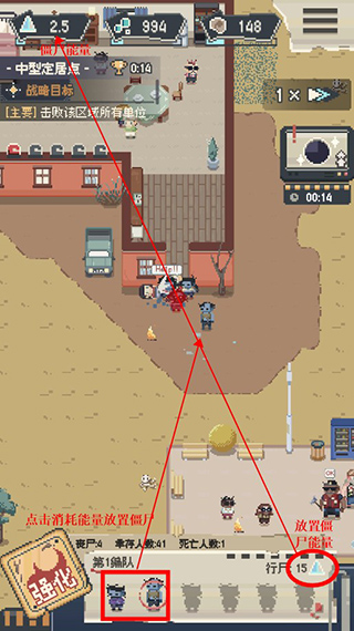玩家可选择下方的僵尸进行释放,只需点击地图上自己想要进攻的位置就能完成释放操作。释放僵尸需消耗能量,能量会在左上角自动恢复,而右下角显示的是释放僵尸所需的能量数值。
