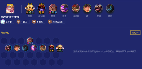 1、福星阵容亮相于lol云顶之弈S4赛季,彼时,福星深受不少玩家喜爱。原因在于玩福星趣味性十足,发育速度也很快。随着金铲铲之战中福星的登场,在此,小编为大家推荐一套阵容:火男、塔姆、布隆、安妮、猪妹、瑟提、卡特以及莎弥拉,其中主要输出位为瑟提、卡特和莎弥拉。