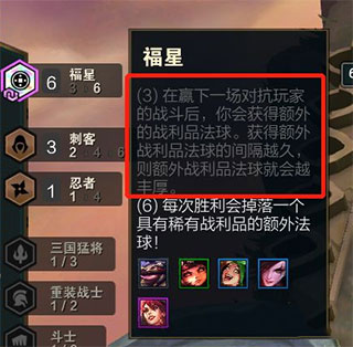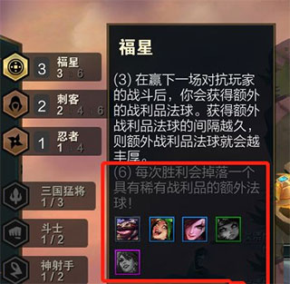 2、阵容羁绊效果,6福星每回合胜利之后会获得一个额外战利品发球而且时间越长战利品越好,这就是我前面说的为什么福星发育的快,只要我们能凑齐福星就可以获得额外的奖励在各方面都很有优势。