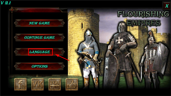 1、玩家启动兴盛帝国游戏,进入游戏的菜单界面,于界面左侧寻找到language(语言)选项栏。