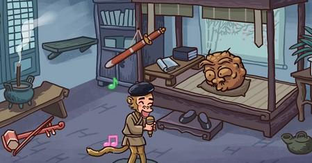 轻点左上角的树枝,知了便会现身,接着把油漆桶放置在知了上面,使其摇身变为金蝉,最后把金蝉拖拽至最右边的和尚身上,如此即可。