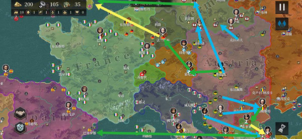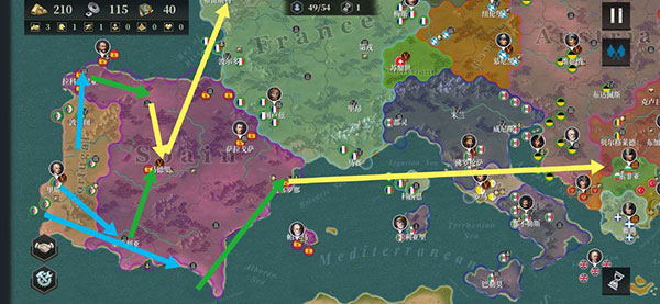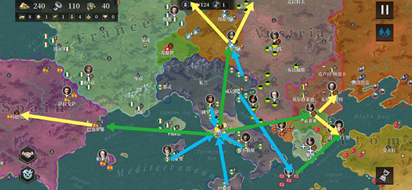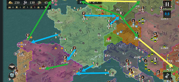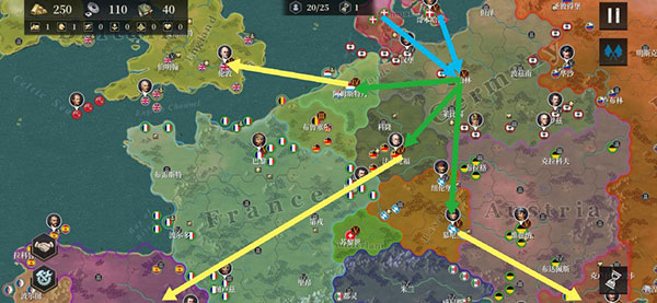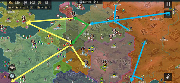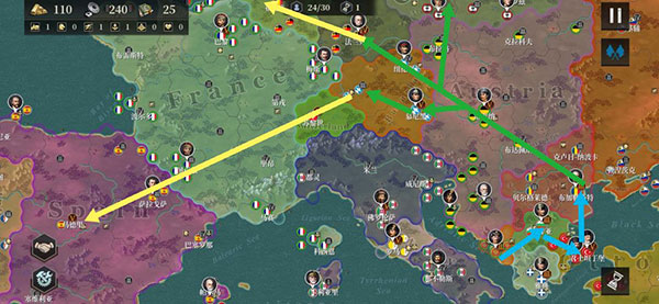 2. 灭教皇后,让本土部队分出一队前往中部作战。占领中部后,派少量兵力与队友协同歼灭普鲁士。同时,在中部集结一批兵力,为登陆英格兰做准备。