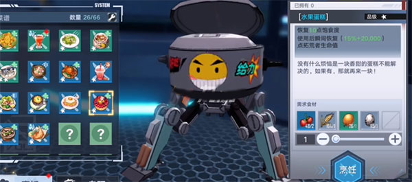 然后就是去烹饪锅处点击进行烹饪,不过这里要注意一点,其实妮可的信息是不全的,因为在水果派的食谱中我们可以看到还需要西红柿,等着四种食材全集齐了就可以开始制作了。