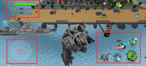4、左侧为移动方向键,右侧为攻击属性,操控角色对相应目标进行破坏。
