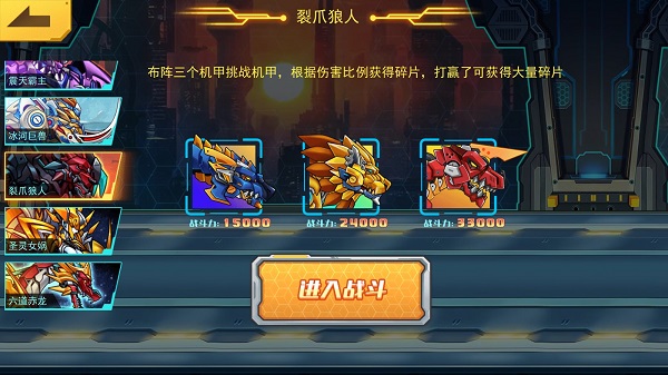 紧接着回到主页,点开“每日副本”,于众多机甲里寻得「烈爪狼王」,随后派出三个你所拥有的机甲展开战斗,按照伤害比例,若打赢便可获取碎片。