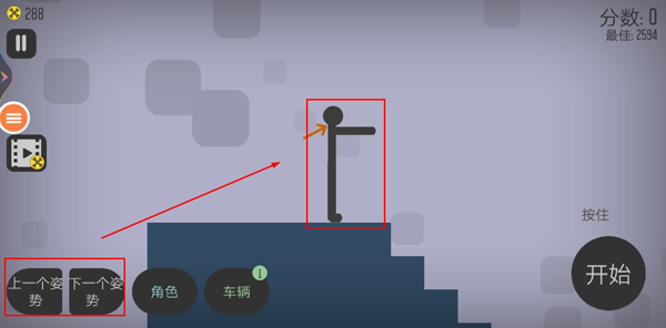 3、当进入游戏界面后,玩家能够点击【上一个姿势】或者【下一个姿势】,以此切换火柴人向下坠落的姿势。此外,玩家还能够点击【车辆】,为火柴人增添道具,这样火柴人在游戏坠落过程中就能解锁更多姿势并提高分数。