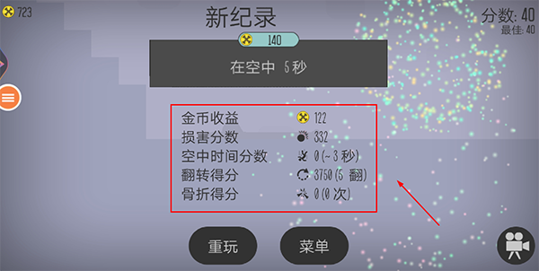 5、当火柴人完成坠落,玩家就能看到自己在游戏里获得的分数与奖励。需注意,若分数不足,是无法解锁下一关的。
