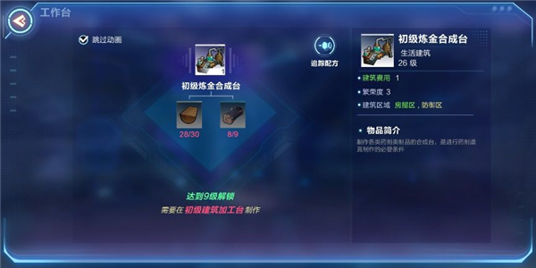 不同的建筑可以制造不同种类的东西,分别为装备,建筑,化学品,食品。配方的获取需要靠探索世界的进度,商店购买,等级解锁,主线剧情解锁。