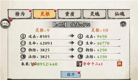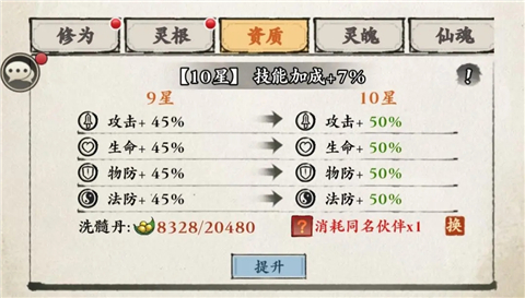 2、优先升星(也就是资质)再考虑灵根。(升星增加百分比属性,灵根则直接增加数字,百分比更划算)。