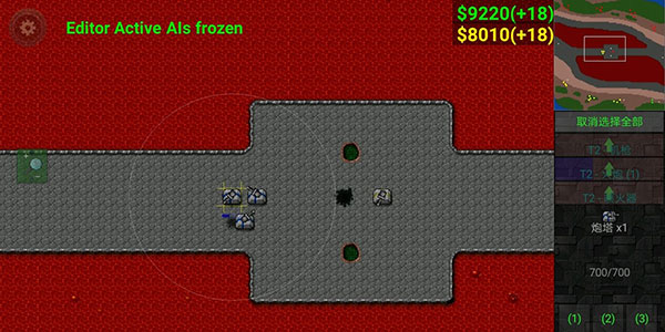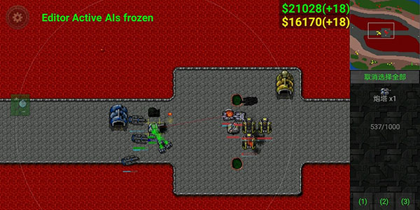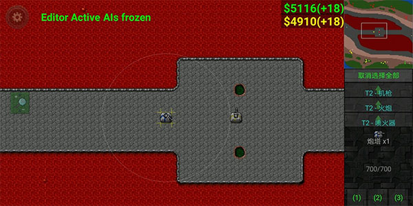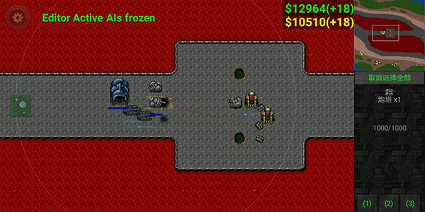 在游戏中使用激光坦克时(图片呈现的情况是假的),由于处于沙盒模式,很难模拟出正常对战情形。因为资金不足,四号位虽要出激光坦克,但在激光防御方面存在极大欠缺。而三号位只需集中火炮火力攻击激光坦克,并建造防御塔进行修复。如此一来,四号位的激光坦克很难获得输出机会,大概率白白浪费。为减少损失,回收二级陆工,三号位最终顺利占据中场。以上这些是我在对抗火炮时采用的方法,然而都以失败告终,目前还没遇到能够有效对付火炮的办法(好像只有我一个人用这种打法,那就姑且称之为雪风式火炮流吧) 。