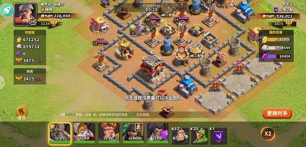 4、现阶段若游戏资源不足,可前往主界面右下角点击“对战”,在这里能反复刷新你有能力战胜的人机对手,每日可进行60次对战。当粮食储备满额时,可选择给英雄进阶;若石头数量足够,则用于升级城墙;要是粮食和石头都已达上限,还能刷新神秘商店。此外,在资源爆满的情况下,于推图、攻城等地方(主界面对战除外)获取的资源,会以邮件形式暂时保存。税收的时间限制为12小时。而且,我个人认为税收中的招兵买马非常划算,有条件的玩家不妨全部购买。