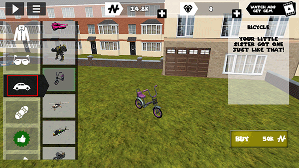 6、在这个游戏里,除了房租,其他只要是挡路的,像骑车、座椅之类,都能用脚踹,一脚就把它们踢开护栏,甚至角色也能被你用腿踢开。通过撞人的方式来赚取金币,不失为一个不错的选择。