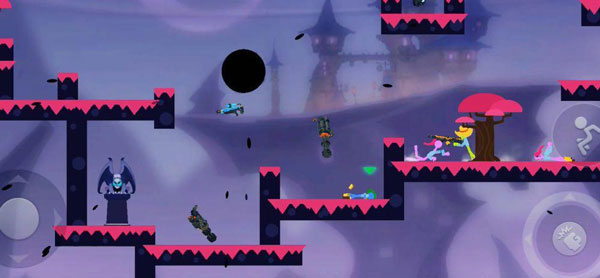 3、在没有捡到武器之前,键盘的中心是拳头形状,捡到武器后就会变成枪支,这里我们需要注意的是激斗火柴人中瞄准开枪与其他游戏不同,并不是左边的移动键盘控制的,而是右边的开枪键盘,这是摇杆式的键盘。