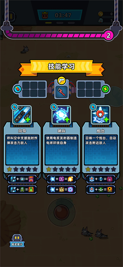 3、当上方能量条收集满时就会有一次技能的选择,根据自己的策略来选择合适的技能