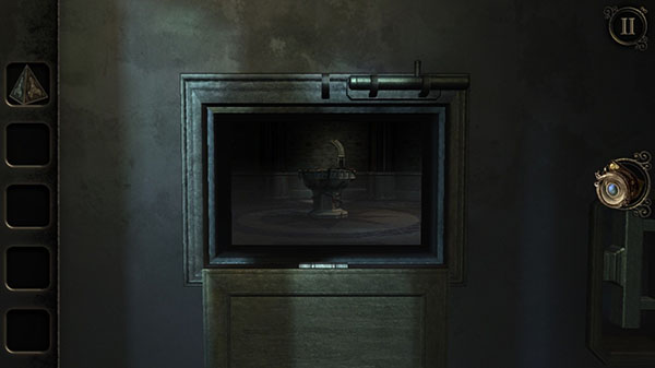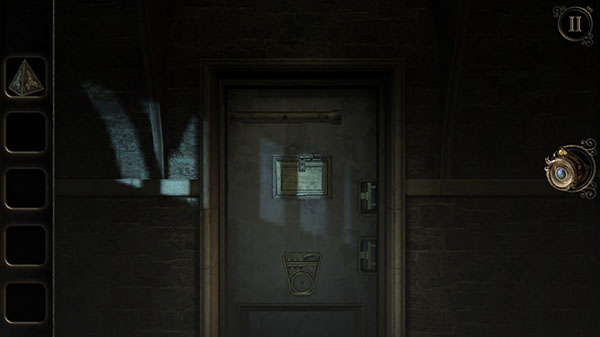 14、当取出三角后,场景将会发生切换,玩家会察觉到自己身处一个密室之内。在玩家面前,有一扇紧紧锁住的门。这时,玩家需要双击门上红圈所标识的窗户,从而将窗户打开。