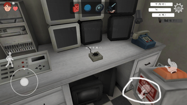 2、玩家需借助地图中的道具逃离此地,点击右侧“手”图标来拾取道具,点击左侧人物图标能够下蹲。