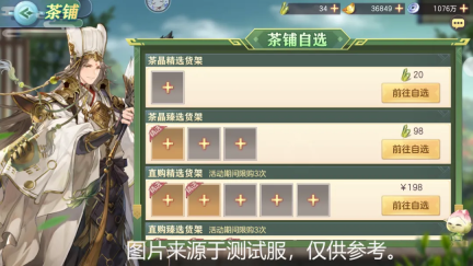 只需轻点茶铺货架上的“加号”按钮,就能在货架的“精选”与“普通”商品中随心挑选。通过消耗货架所标记数量的茶晶,亦或是直接用人民币购买,就能轻松获得选中的商品啦!如此超值特惠,千万别错过哟!