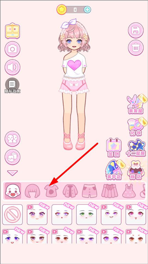 3、第一步先为娃娃挑选适配风格的美瞳并换上,接着按顺序更换发型、上装、外套、下装等。