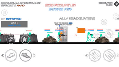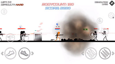 游戏中的按键设计非常经典,在屏幕的左边是控制人物左右移动,连续点击两下还会进行扑越躲避子弹,并且射击方向是固定的,需要你不断的移动才能快速的打击到敌人,无法自由转换,点左边就朝左边打,点右边就朝右边打,非常的有意思。