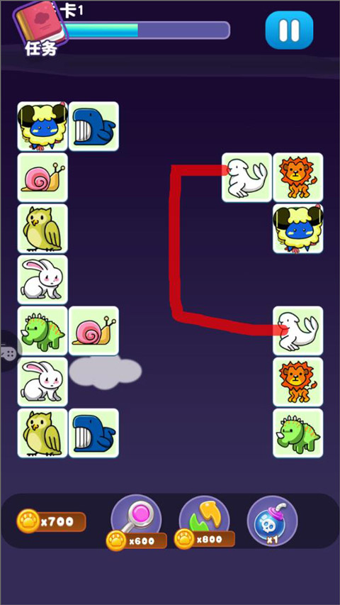 3、进入游戏首先从第一关开始,玩家需要把同样的动物连线进行消除;