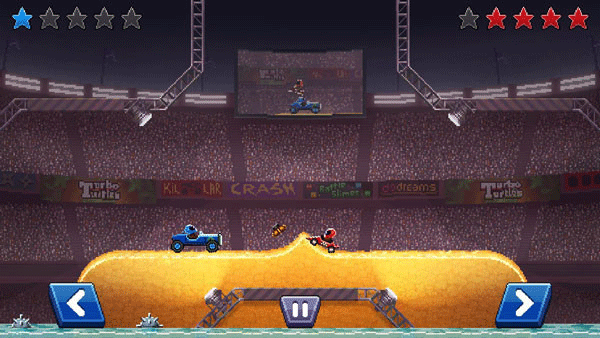 要是加速太猛,车子就会仰头。通常来说,保持在45°角是进攻的绝佳选择。而且不同的车子,小人所在的位置不一样,相应地就会产生不同的打法策略。值得一提的是,车与车之间存在相互克制的关系,就像上图里的拖拉机和铲车,因为拖拉机上的人物位置比较靠后,铲车与之正面交锋就很不占优势。