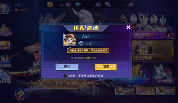 1、进到游戏你会收到一个来自系统的匹配邀请,点击“同意”