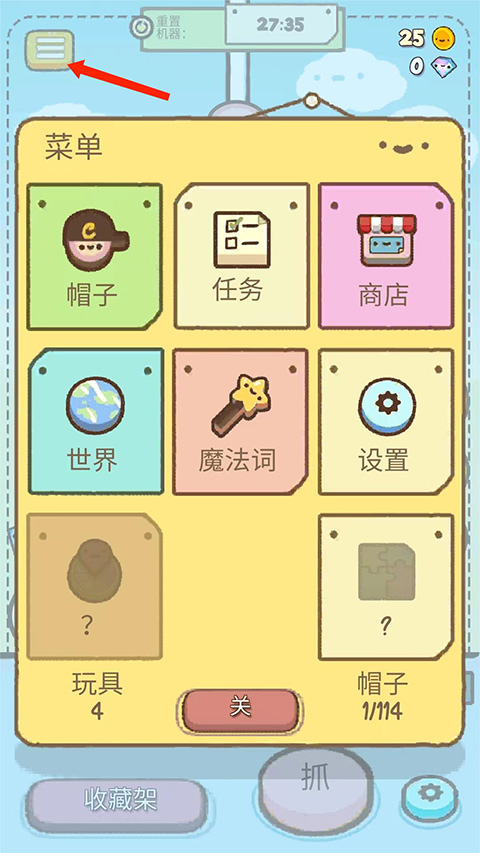 7、点击左上角的【三条杠】图标,即可进入菜单界面,该界面包含【帽子】、【任务】、【商店】、【世界】、【魔法词】、【设置】等选项。