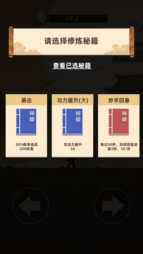 3、不同秘籍的组合可以带来不同的战斗效果,期间你可以通过“查看已选秘籍”进行取舍。