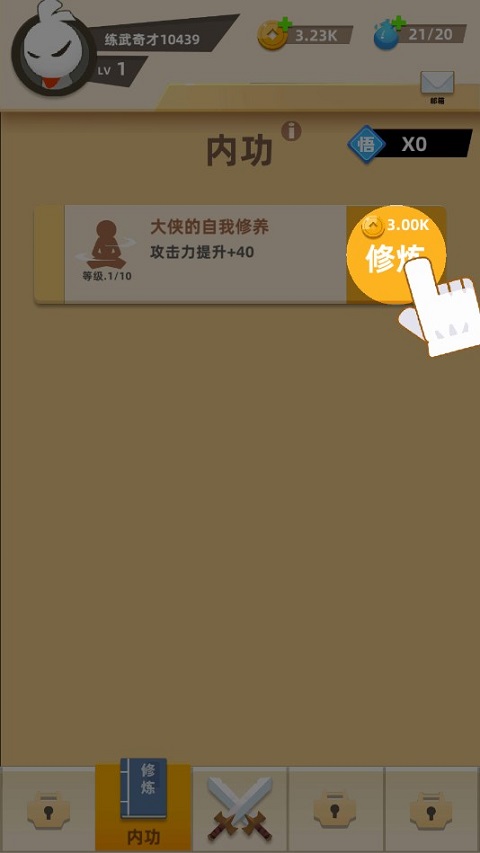 1)返回主界面,选择“内功”,可以花费金币进行修炼。