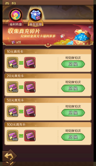 6、这些真充碎片能够用于兑换真充卡,可兑换的档位有10、20、50、100这四种。