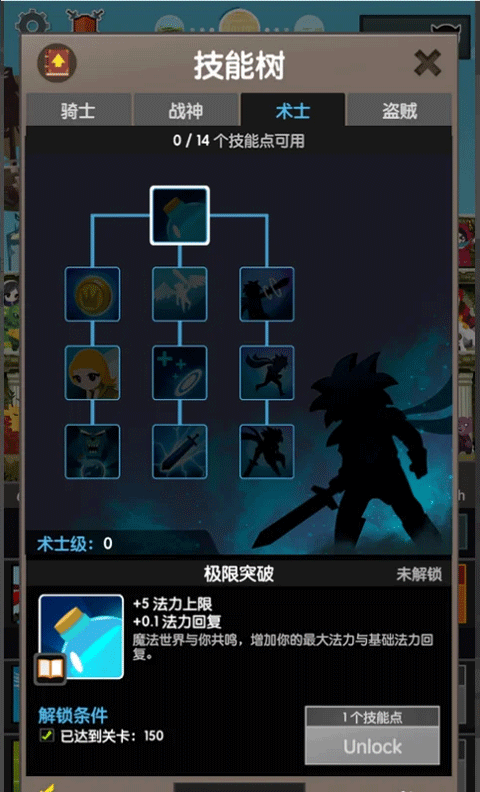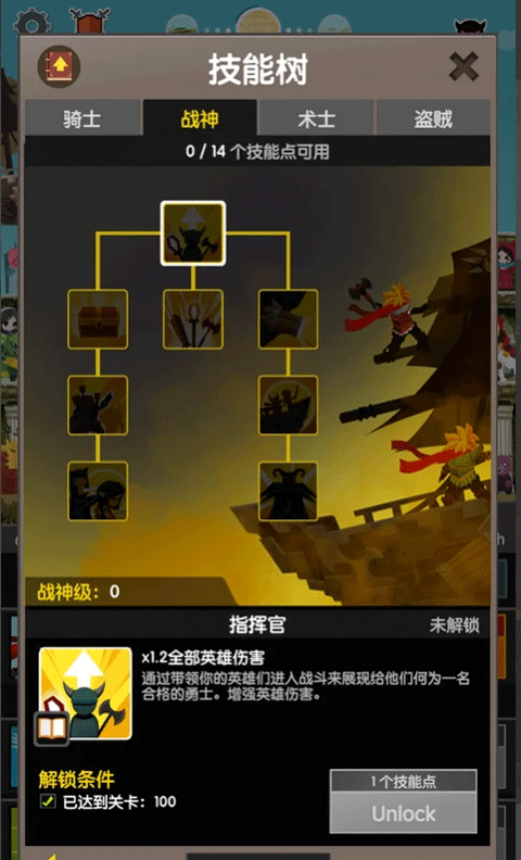 1、首先,技能树分为四种天赋——骑士、战神、术士、盗贼,其中的骑士这一加点主要是活跃点击使用的,如果你经常在线点击玩,那你非常适合这个天赋。