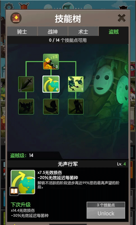 4、至于盗贼加点也是我嘴热衷的加点,一技能加黄金,二技能加上无声行军后妥妥的变成放置游戏。