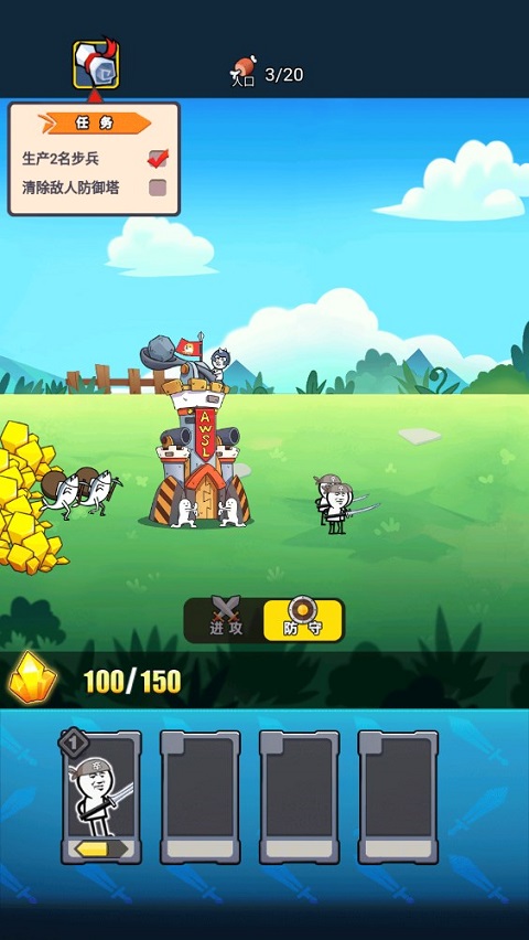 咸鱼矿工正忙于采矿,采集到的矿石能够用来生产兵力。与之类似的游戏《火柴人战争遗产》有着相似操作,其独特之处在于采用滑稽幽默的游戏画风,搭配网络流行用语的表情包,使得整体画风格外诙谐。而且,该游戏玩法延续经典的策略塔防机制,依靠咸鱼矿工的采矿进度来收集资源,进而生产士兵。