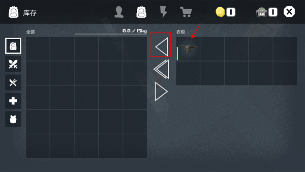 上方红色框框所选择的向左方向键,作用是把右边的物品移动至左边。要是想一次性把东西放入左边的包包里,点击下方双向且指向左边的箭头,就能将所有物品都放进背包。