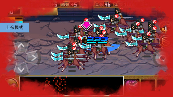 打的时候可以先让自己的兵顶住敌方骑兵,自己一个冲撞过去打弓兵、步兵,用最快的速度降敌方最多的士气,当士气为0时就可以大杀特杀了(此时敌军只会跑)
