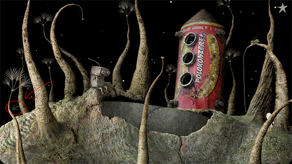 之后要帮人找烟袋。点击人所坐树桩下方的洞,狗会跑进洞里。狗跑到怪物跟前停下,点击狗身后的植物,狗就会发出“xuxu”的声音,植物便会开始长高(不得不说这个设计还挺幽默的)。
