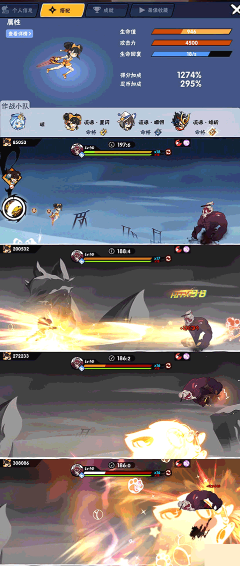 面板图(天赋含 +100 忍术攻击力)。实际测试时携带两个“闪点”,所以忍术期间测试面板数值为 4500 + 100 + 90×2 = 4780 。忍术期间还吃了两个镖,镖的伤害是 4680×4 = 18720 。