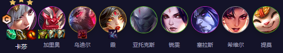 卡莎、加里奥、乌迪尔、霞、亚托克斯、锐雯、塞拉、希维尔、提莫