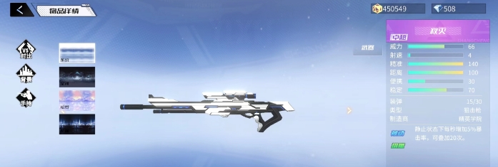 这把武器的优势在于其技能,当玩家持有该武器处于静止状态时,能够持续累积暴击率。在这一buff的作用下,远距离狙击所导致的子弹伤害衰减将显著降低。