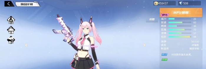 MP5 - 喵喵,这是一把传说级别的冲锋枪,造型十分可爱且小巧玲珑,在游戏里,它是独一无二全粉色的枪支武器。别看这把冲锋枪外表萌态十足,其威力数值却相当高,而且击中敌人任意部位造成的伤害都相同,不存在四肢伤害衰减的情况,堪称一把实力强劲的冲锋枪。然而美中不足的是,它的精准度着实有些低,玩家在战斗过程中需要更加专注地瞄准。