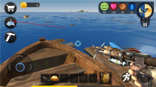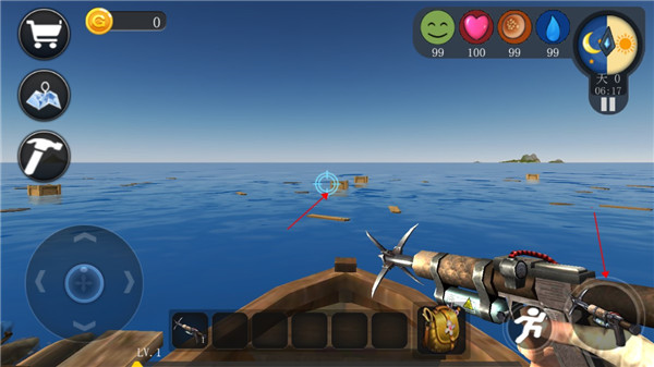 1. 点击“新游戏”进入游戏后,玩家会置身于一条小船上,需借助手中的标枪获取物资,将准星对准木箱或者浮木,长按右下角图标进行发射。