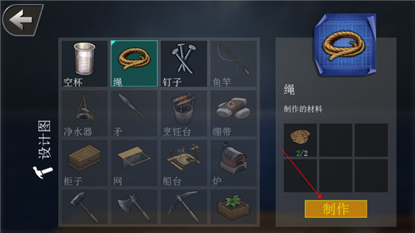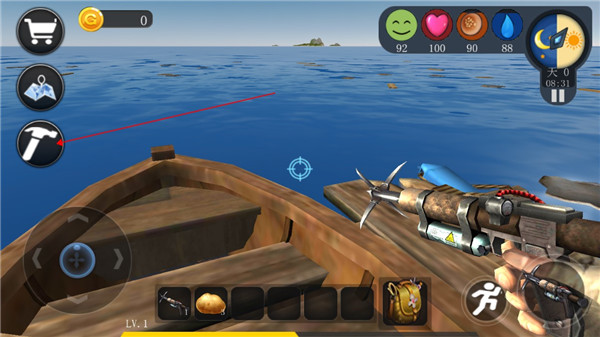 3、想要在这个小船上生存下去,就必须要学会利用拾取的物质来制造有用的物件,点击左边的锤子图标进入制作页面。